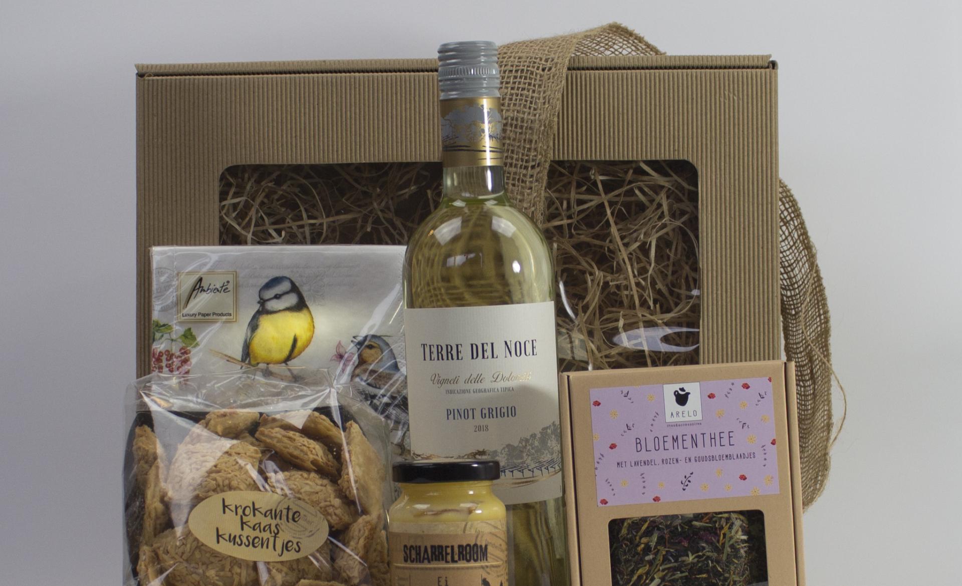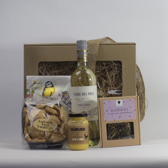 Jannie is een pakket waar je iemand mee verwennen kan. Samen een wijntje drinken, of een kopje thee zetten. Een landelijk servet maakt het pakket compleet.