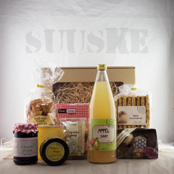 Handgemaakte bonbons van chocolaterie Albert is kwaliteit van de bovenste plank en die zitten ook in dit cadeaupakket.Boerin Suuske; een goedgevuld pakket om iemand eens echt te verwennen!